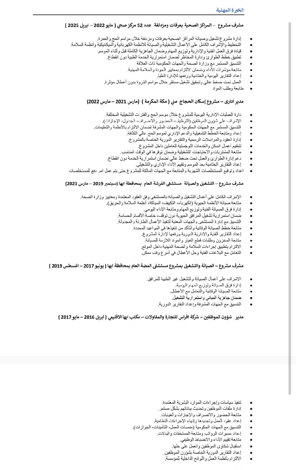 اداري ومدير مشاريع بخبرة أكثر من 8 سنوات في المملكة العربية السعودية، عملت في مجالات متعددة تشمل شؤون الموظفين، إدارة المشاريع، التشغيل والصيانة، المحاسبة الادارية، والاشراف الميداني، خاصة في المراكز الصحية والمستشفيات والمشاريع الموسمية (الحج والعمرة) متميز في تنظيم العمل، متابعة الفرق، اعداد التقارير، ضبط الميزانيات، والتنسيق مع الجهات المختلفة، مع القدرة على العمل تحت ضغط وتحقيق أهداف المشروع