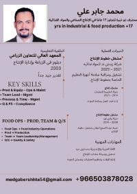 الاسم محمد جابر علي أحمد السن 40 خبرة في مجال التصنيع الغذائي 17 سنة تخزين وتعبئة وتغليف وابحث عن فرصة عمل داخل المملكة