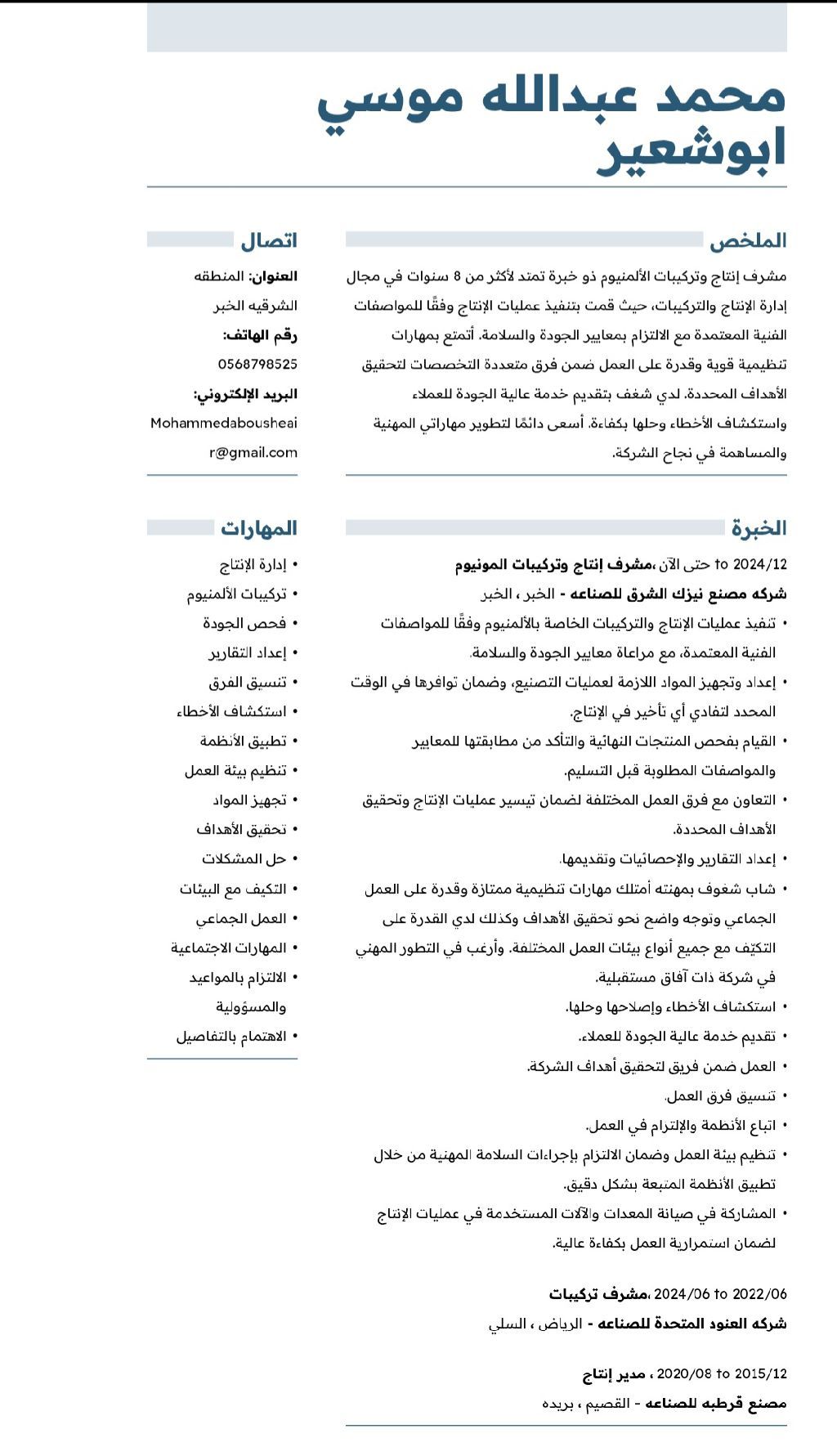 مشرف انتاج وتركيبات ألومينيوم متواجد في المنطقة الشرقية المملكة العربية السعودية