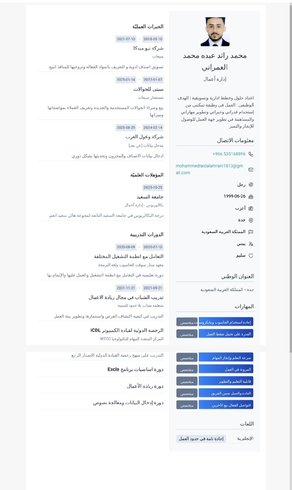 مدير مبيعات وإدارة تسويقية ومدخل بيانات وخبرة عمل سنتين، وباقي خبراتي في السيفي في الصورة أعلاه