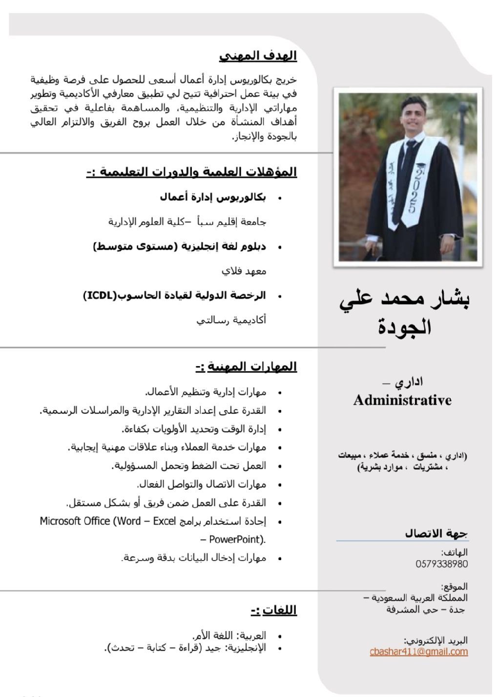 شاب مقيم في جدة، حاصل على بكالوريوس في Business Administration، ابحث عن فرصة عمل في شركة محترمة في المجال الاداري أو المبيعات أو خدمة العملاء امتلك مهارات قوية في التواصل، التنظيم، وإدارة المهام والعمل ضمن فريق، مع القدرة على تحمل ضغط العمل وتحقيق أفضل النتائج. طموح وأسعى لتطوير خبرتي المهنية وبناء مسار وظيفي ناجح. متاح للعمل فورا. للتواصل يرجى ارسال رسالة خاصة
