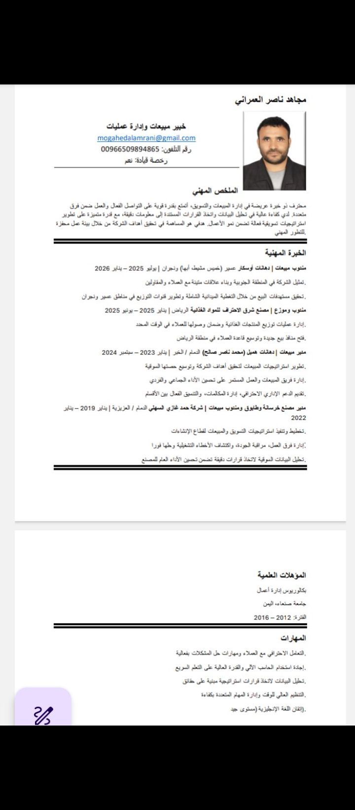 مجاهد يمني بكالوريوس ادارة أعمال ابحث عن عمل لدي خبرة في ادارة مصانع الخرسانة والطابوق وعملت كمندوب مبيعات خرسانة وطابوق وعملت كمندوب بيع دهانات بويات وعملت مدير مبيعات معرض دهانات
