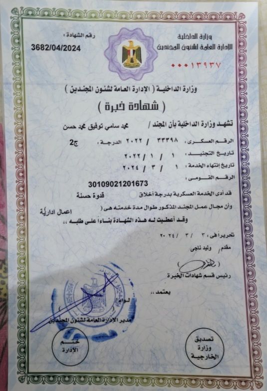 مدخل بيانات وكاشير مصري (24 سنة) خبرة عامين بوزارة الداخلية المصرية (مدخل بيانات وتنظيم اداري) بشهادات معتمدة من الوزارة. وعملت فني جودة بشركة ECC المصرية لمستحضرات التجميل ومعي شهادة خبرة معتمدة من الشركة. ومحترف بمجموعة Microsoft Office وسريع في تعلم أي شيء جديد علي يخص الشغل على الحاسوب وخبير بصيانة الهاردوير والسوفتوير امتلك الانضباط والدقة في اتمام المهام الادارية والتقنية، وجاهز للعمل فور