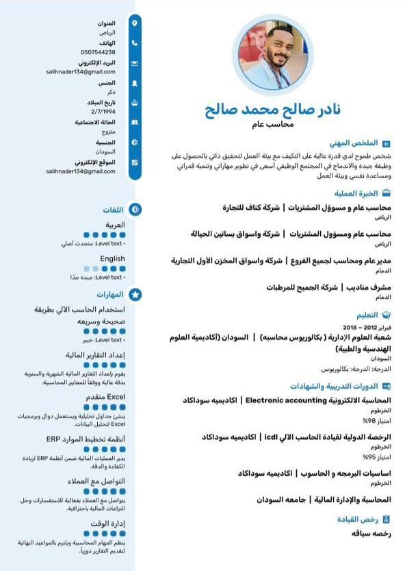 محاسب ومسؤول مشتريات، خبرة 7 سنوات المواد الغذائية والهايبر ماركت محاسب متفرغ لكافة العمليات الحسابية من والى درجة التعليم بكالوريوس المحاسبة الخبرات ادارة المستودعات من أمين وادخال الفواتير وأخراجها وجردها بالطريقة الصحيحة خبرة في البرنامج المحاسبية أونكس برو وأدوا وأسماك