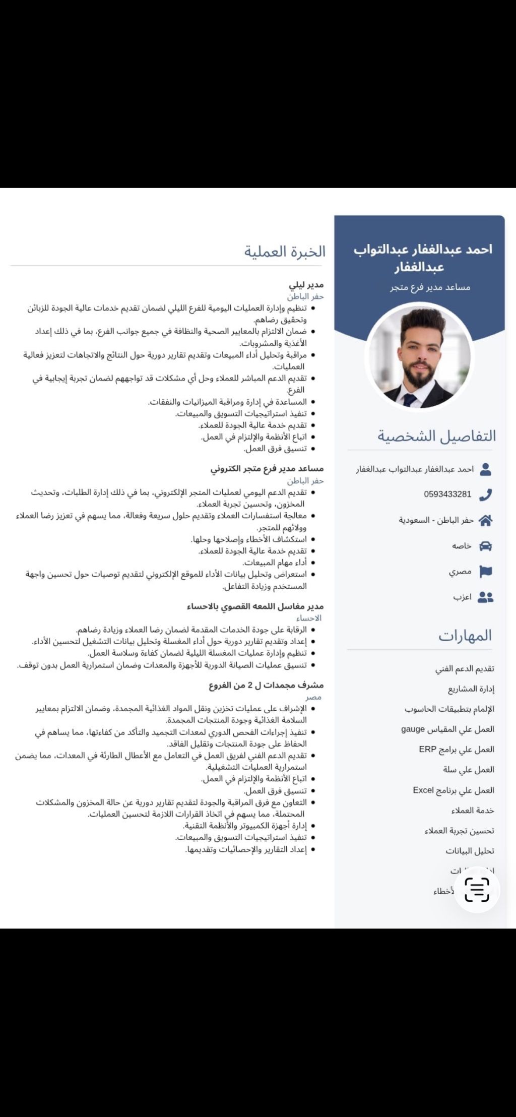 متاح للعمل كمدير متجر الكتروني مواد غذائية خبرة في إدارة الطلبات والمخزون وزيادة المبيعات تحسين الأداء وخدمة العملاء جاهز للعمل فورا