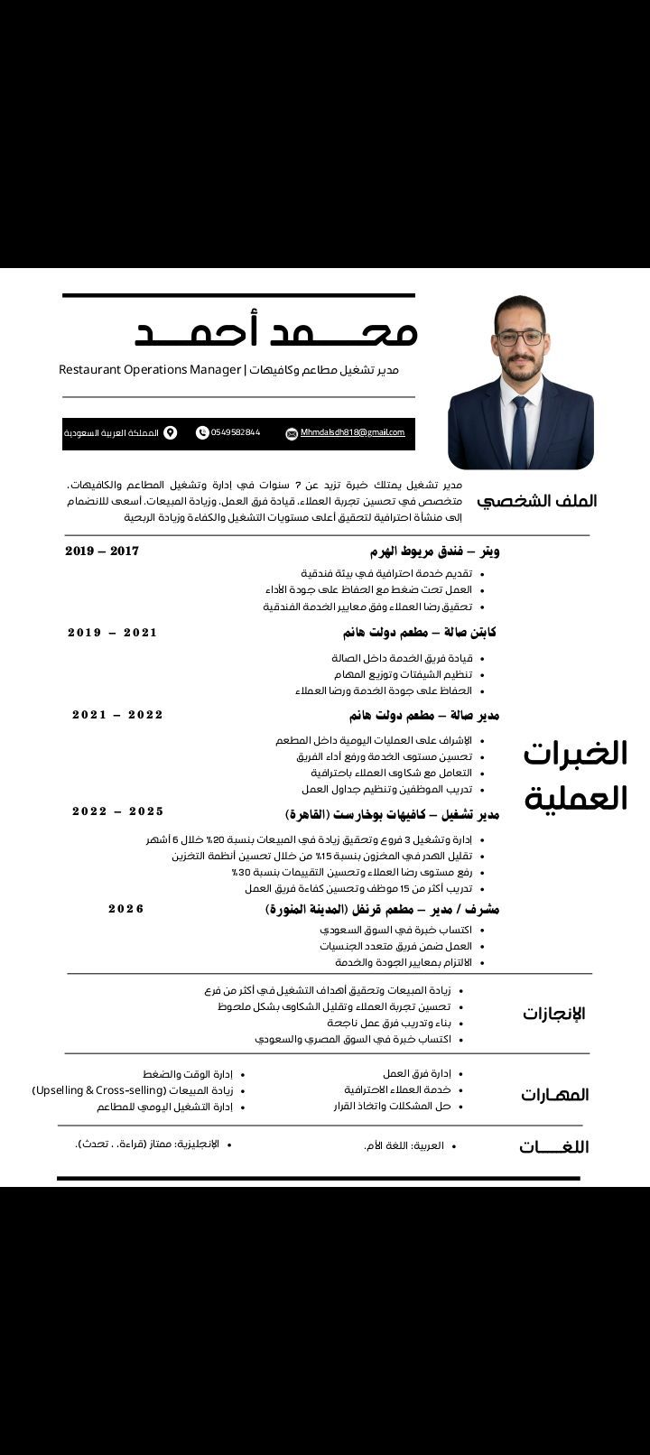 مدير تشغيل مطاعم وكافيهات 12 عام في المجال عملت في فندق ماريوط الهرم مطعم دولت هانم وكافيهات بوخار ست القاهرة ومطعم قر نفل