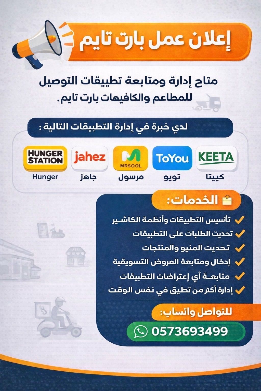 تأسيس التطبيقات وأنظمة الكاشير والتأكد من عملها بكفاءة، تحديث التطبيقات بشكل دوري وتحديث منيو والعروض، متابعه الاعتراضات والتأكد من حلها، ادارة أكثر من تطبيق في نفس الوقت