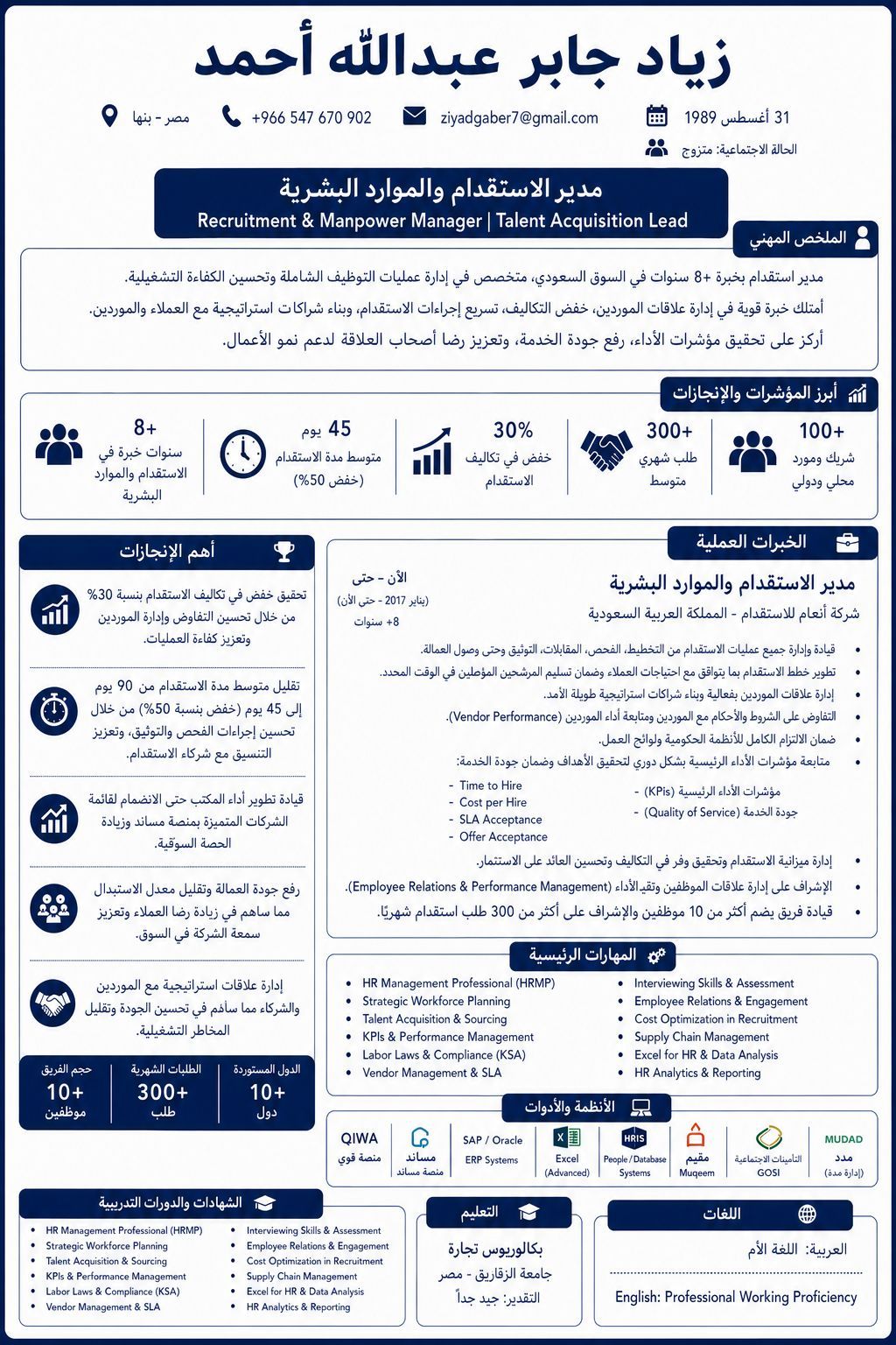 مدير استقدام بخبرة تتجاوز 7 سنوات في قطاع الاستقدام وإدارة الموارد البشرية، وامتلك خبرة واسعة في قيادة وإدارة عمليات الاستقدام بكفاءة عالية، مع المام شامل بكافة الأنظمة والاجراءات المعتمدة داخل المملكة. أتميز بالقدرة على وضع وتنفيذ استراتيجيات فعالة لتسريع اجراءات الاستقدام، وتقليل التكاليف، وتحسين جودة الخدمات، مع ضمان الالتزام الكامل بالأنظمة واللوائح. كما امتلك خبرة قوية في إدارة العلاقات وألت
