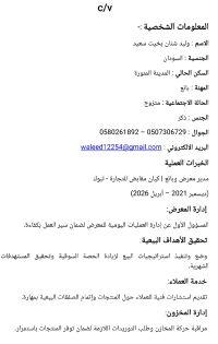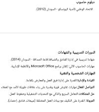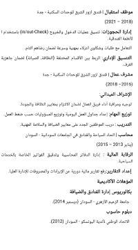 متخصص في إدارة الفنادق والضيافة والمبيعات، امتلك خبرة عملية تمتد لأكثر من 10 سنوات في السوق السعودي والسوداني. متميز في الاشراف الداخلي الهاوس كيبينج، والاستقبال عملت في الشقق الفندقية. إدارة المعارض التجارية، بائع ومدير معرض أسعى لتوظيف مهاراتي القيادية والبيعية في بيئة عمل احترافية تساهم في تحقيق أهداف المؤسسة وتطويرها