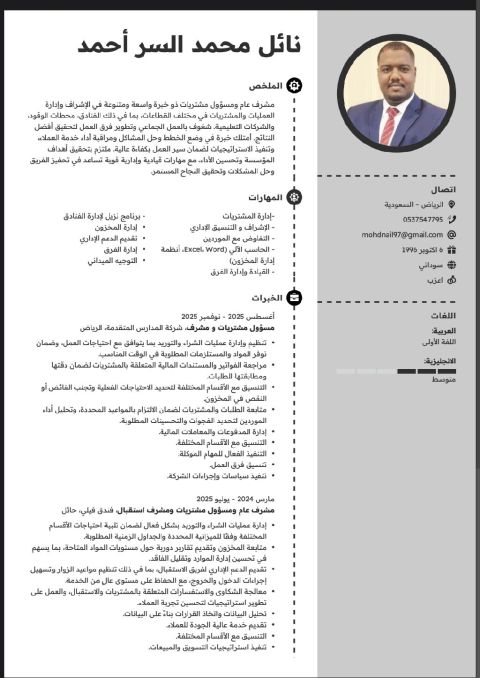 سوداني خبرة 9 سنوات في الأعمال الادارية مدير قسم المشاريع بشركة صيانة وتشغيل وخبرة في الموارد البشرية HR والمحاسبة المالية محاسب والمهام الادارية والمالية الصندوق واستخراج الضريبة من خلال المبيعات وإدارة الأعمال العمر 32 سنة مقيم في أبها وخميس مشيط حاليا مقيم في تندحة جاد للعمل