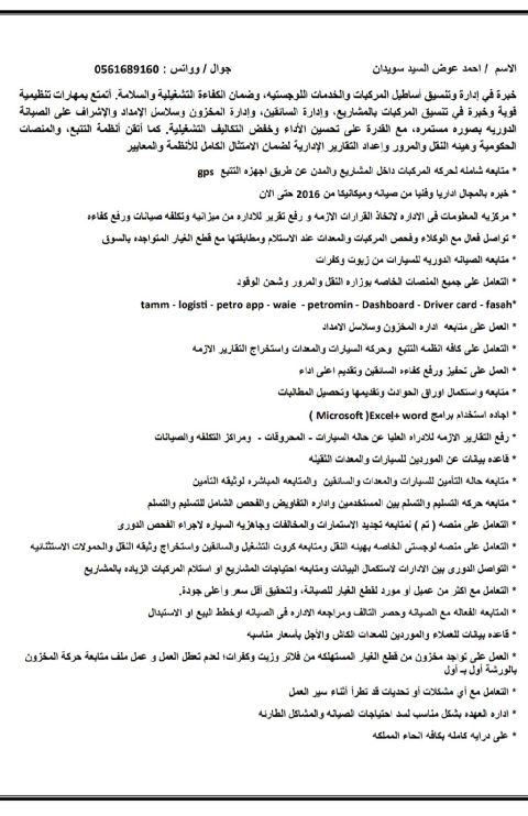 مسؤول حركة خبرة في إدارة وتنسيق ومتابعه أسطول المركبات والخدمات اللوجستيه، وإدارة السائقين والتسليم والتسلم ومتابعه الصيانة الدوريه للسيارات وتوفير قطع الغيار واجراءات الفحص الدوري وأتقن أنظمة التتبع gps وجميع المنصات الحكومية وتم ولوجستي وتطبيقات شحن الوقود واستكمال متطلبات الحوادث ومطالبات التأمين والتعامل ع برامج كمبيوتر ومتابعة وثيقة التأمين وادارة العهده وموردين المعدات واعداد تقارير للعمل