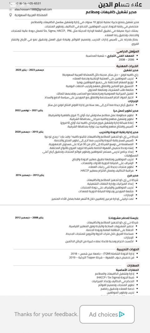 ملخص الخبرة المهنية محترف ذو توجه نحو تحقيق النتائج، حاصل على درجة البكالوريوس في المحاسبة، ويتمتع بخبرة واسعة في خدمة العملاء، والدعم الفني، والعمليات اللوجستية. لديه سجل حافل في إدارة تطبيقات التوصيل، وأنظمة تخطيط موارد المؤسسات (ERP) وحملات التسويق الرقمي لدفع عجلة نمو الأعمال. يتمتع بمهارات تحليل احتياجات العملاء، والتفاوض على الصفقات، وضمان الكفاءة التشغيلية تحت الضغط. ملتزم بتقديم خدمة عالي