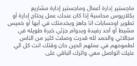 ماجستير إدارة أعمال وماجستير إدارة مشاريع بكالوريوس محاسبة اذا كان عندك عمل يحتاج إدارة أو تطوير أو حسابات أنا جاهز وبخدمتك في أبها أو خميس مشيط أو أحد رفيدة وبدوام جزئي خبرة طويله في مجالاتي والحمد لله قدرت وصلت كثير من الناس لطموحهم في عملهم الحين حان وقتك أنت كل الى عليك أتواصل معي واترك الباقي على موجود في خميس مشيط