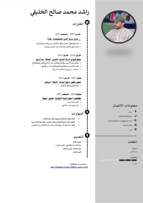مدير معرض يمني خبرة أكثر من 10 سنوات في شركة السيف غاليري وشركات أخرى ولدي خبرة في إدارة معارض التجزئة والاشراف على العمليات اليومية للفرع وإدارة فريق العمل وتوجيههم ومتابعة المخزون والنواقص وتحقيق مستهدفات المبيعات وتحسين تجربة العميل وجميع مهام إدارة الفرع