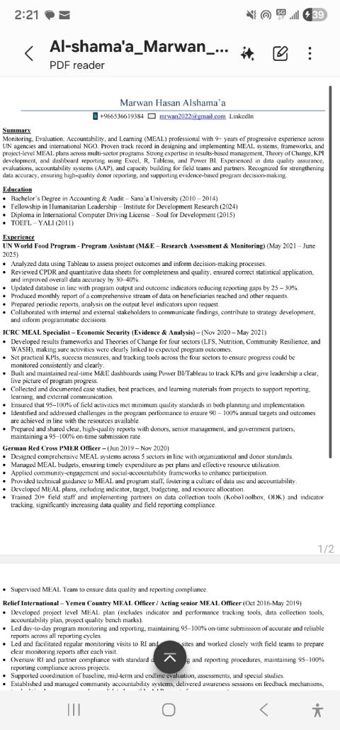Project Management & Impact Measurement Expert MEAL Specialist Reporting Support Ad Description I offer professional services in Project Management, Monitoring, Evaluation, Accountability and Learning (MEAL) and Impact Measurement for non - profit organizations, development initiatives, and community - based projects across Saudi Arabia. With over 9 years of experience supporting national and in