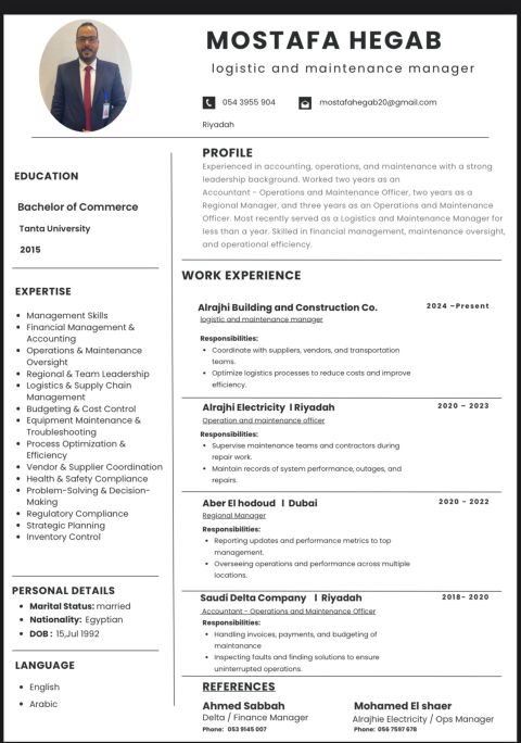 محاسب - مدير تطوير أعمال - إدارة مشتريات (دوام كامل) خبرة 6 سنوات داخل المملكة في إدارة الحسابات، اعداد القوائم المالية، رفع الاقرارات، وتحليل الأداء. خبير في تطوير الأعمال، تحسين الاجراءات، واعداد دراسات الجدوى. إدارة مشتريات احترافية البحث عن الموردين، مقارنة الأسعار، وتخفيض التكاليف. ابحث عن فرصة دوام كامل في أبها لدى منشأة ترغب في رفع كفاءتها وتنظيم أعمالها. أبها - السعودية