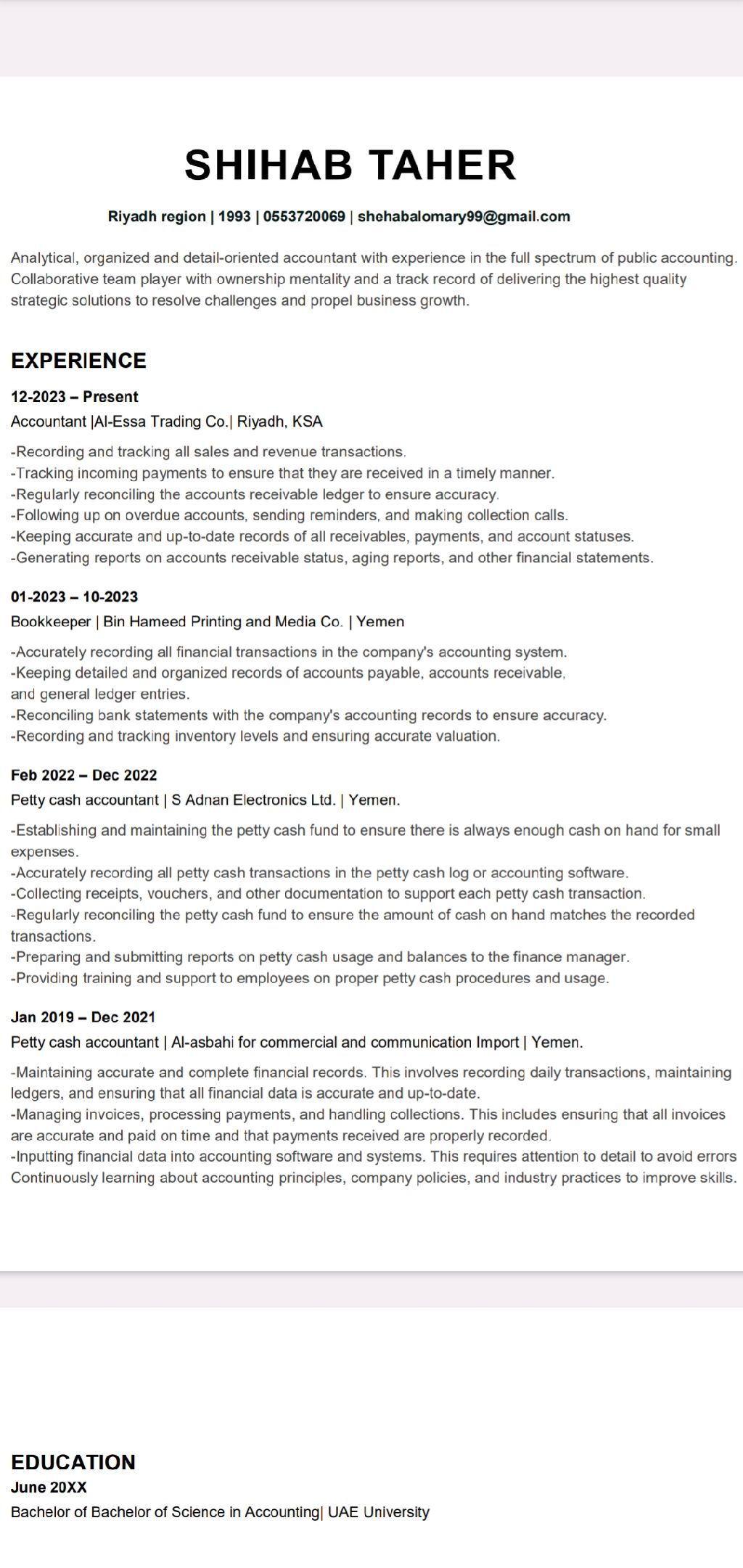 مسؤول عن تسجيل وتحليل العمليات المالية اليومية، اعداد التقارير المالية والضريبية، مراجعة الحسابات والتسويات البنكية، وضمان الامتثال للمعايير المحاسبية المعتمدة
