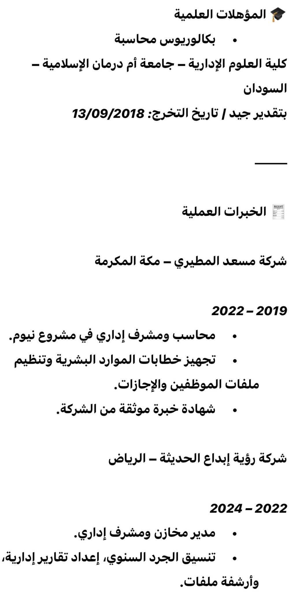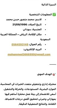سوداني 29 سنة، خبرة قوية في المحاسبة الموارد البشرية والمستودعات والحركة والتشغيل داخل المملكة. ابحث عن فرصة جادة. ملتزم، منظم، أجيد البرامج والتعامل مع الضغط. إقامة نظامية قابلة للنقل. مستعد للعمل فورا