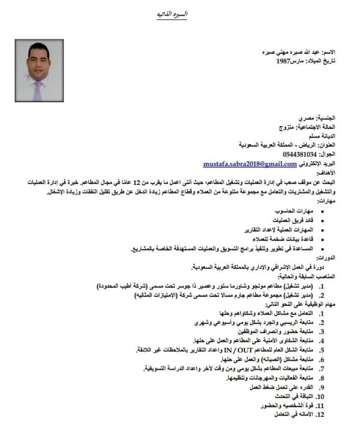 Abdullah Sabra, Operations Manager, Experiences and Skills, extensive experience in managing work teams and organizing daily operations. High ability to raise the level of service and achieve customer satisfaction. Purchasing, inventory and quality control management. Developing marketing plans and achieving operational goals. 12 years of experience in the field of restaurants within the Kingdom