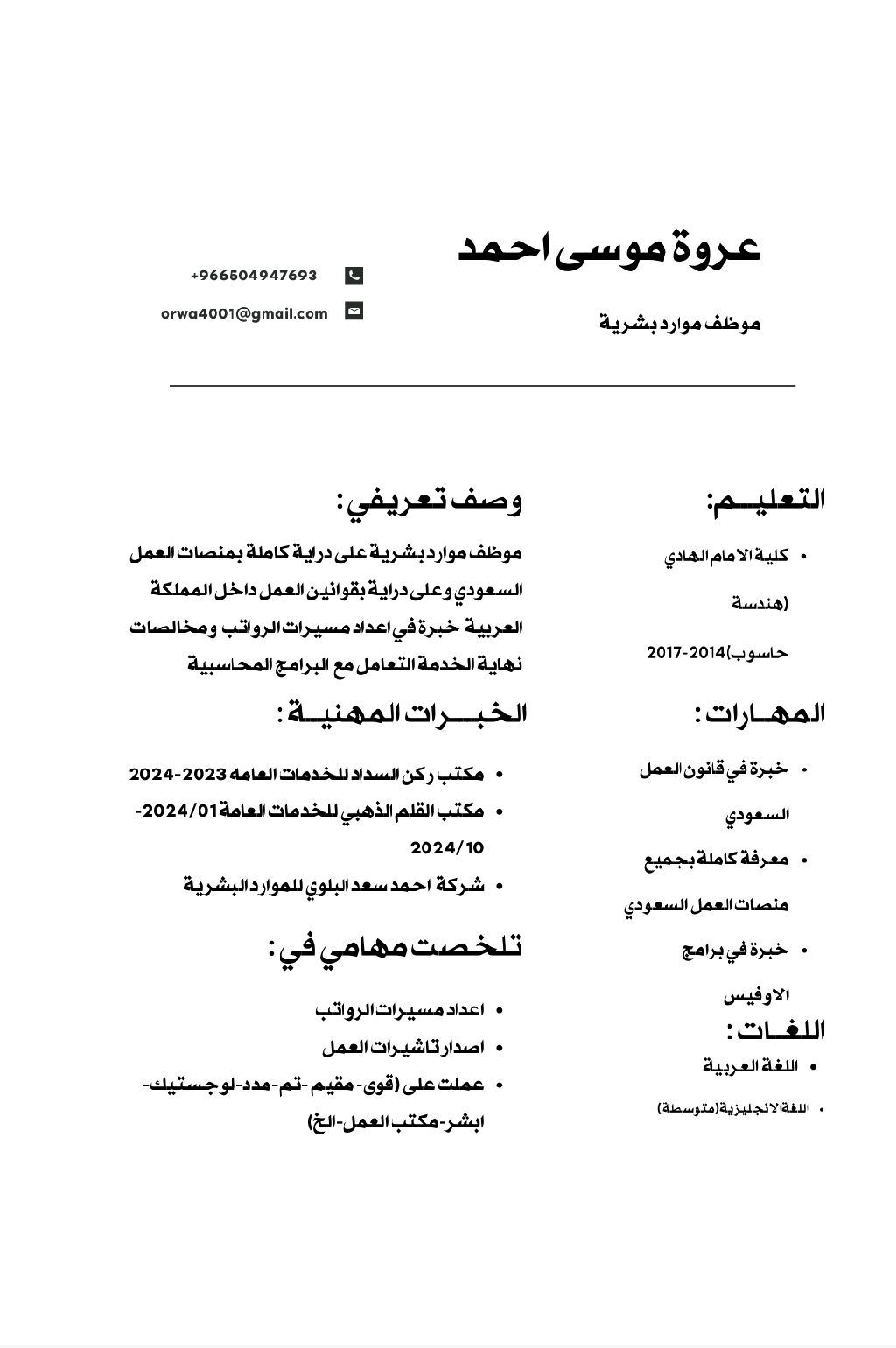 الجنسية سوداني العمر 29 خبرة بادارة الموارد البشرية والتعامل مع جميع المنصات الحكومية مثل قوى مقيم. تم مدد لوجستيك. الخ خبرة باعداد مسيرات الرواتب ومخالصات نهاية الخدمة وتذاكر الطيران ايجاد التعامل مع البرامج المحاسبية والمرسلات عبر الايميل وتنسيق الاجتماعات