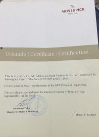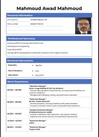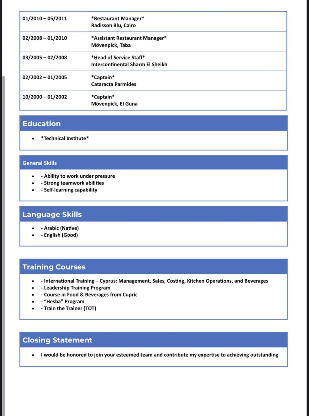 خبرة في السعودية بمجال المطاعم قيثاره لاونج في مكة والطائف مدير تشغيل لفرعين ومطعم بيل ازور التركي كمديرة مطعم ومنزه النخيل جدة مساعد مدير والقاهرة والغرفة وشرم في فنادق وقمت بعمل تدريب في قبرص يشمل الادارة والمبيعات والتكاليف والمطبخ والمشروبات وقمت بعمل تدريب القادة أتشرف بالانضمام الى فريق عملكم