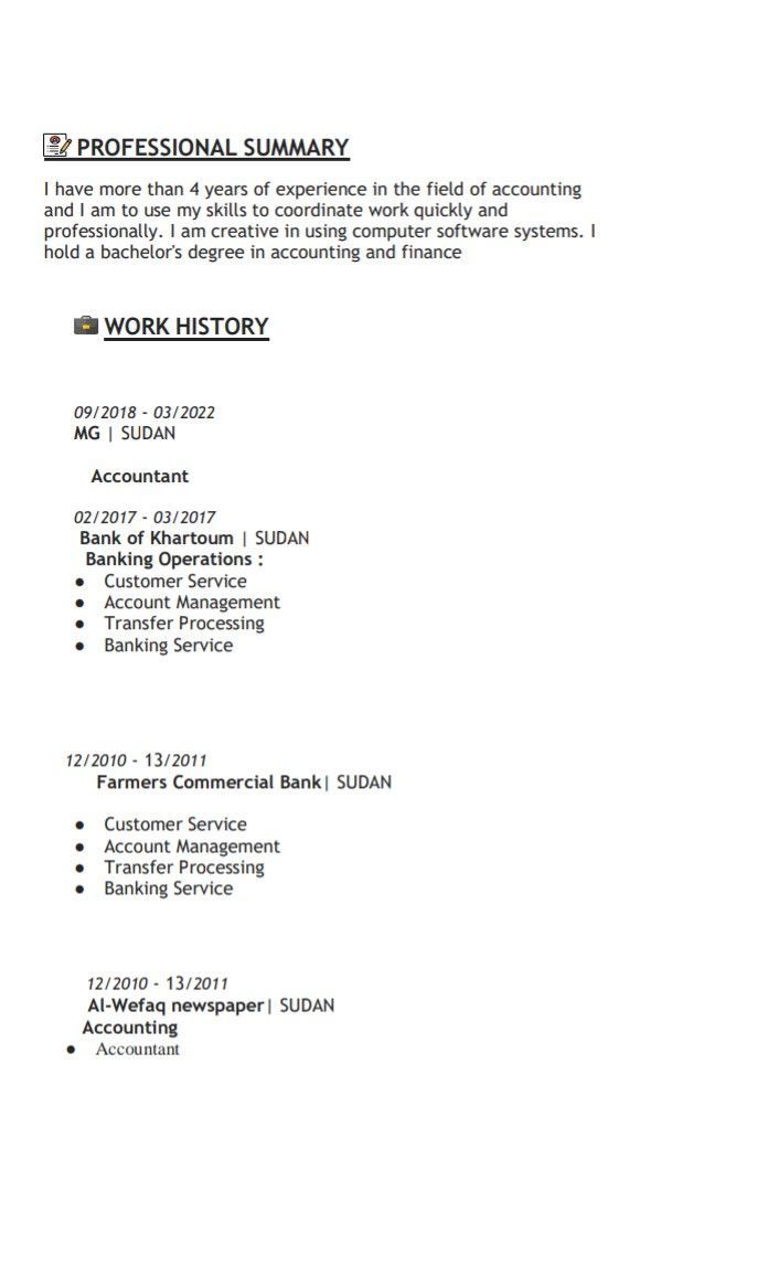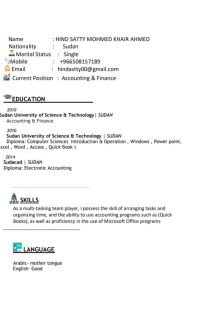 خريج قسم المحاسبة والتمويل جامعة السودان للعلوم والتكنولوجيا لدي شهادة جامعية وشهادة كمبيوتر شهادة دبلوم مايكروسوفت اوفس اكسل، كويك بوكوورد، اكسس، بور بوينت. شهادة دبلوم محاسبة الكترونية، شهادة تطبيق أودو، شهادة اكسل متقدم، أمين مخزن، شهادة تدريب من بنك الخرطوم في جميع وأقسام البنك، بنك المزارع التجاري جميع أقسام البنك، أودو. لدي القدرة علي العمل في روح الفريق، مهارات التواصل، القيادة