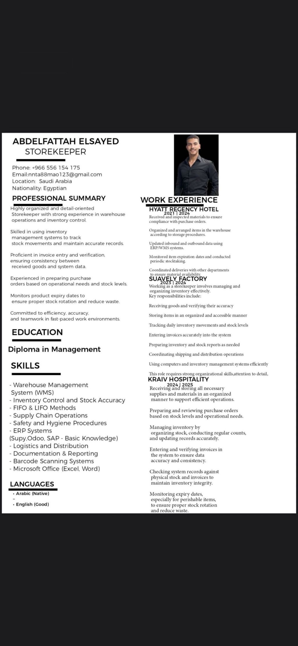 I am looking for a Storekeeper position. I have strong experience in inventory organization, invoice entry, and working with WMS systems. I work with high accuracy and a strong sense of responsibility, and I am seeking an opportunity in a reputable company in Saudi Arabia