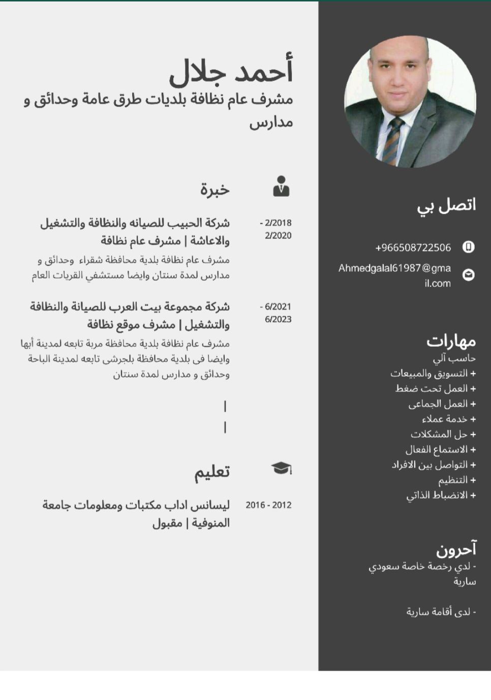 أنا أحمد مصري متواجد في السعودية مشرف نظافة خبرة 6 سنوات بدور على فرصة عمل في مجال نظافة المدن العامة ومجال المدارس أو أي مجال مشابه