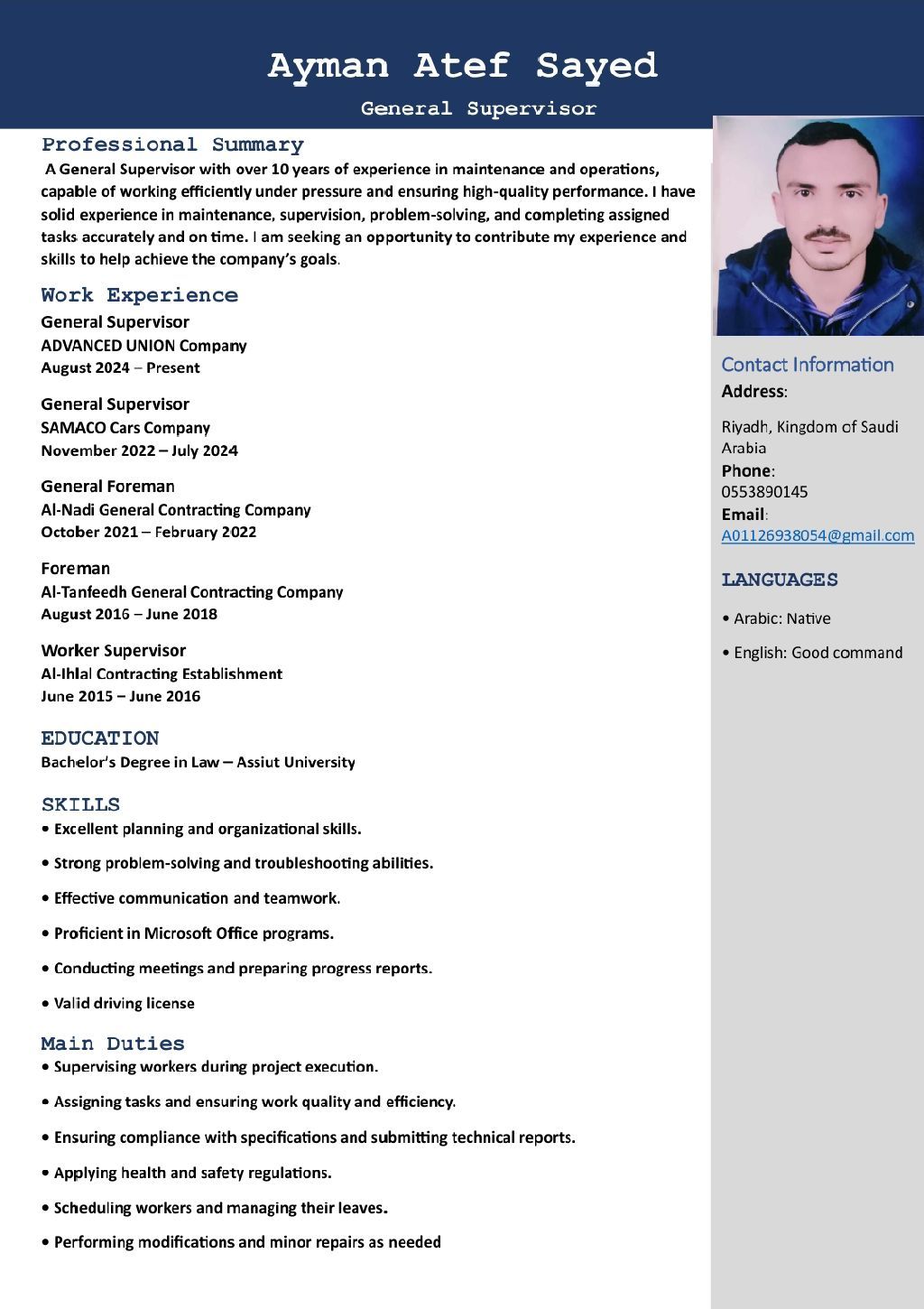 مشرف عام مقيم في الرياض ابحث عن فرصة عمل جيده لدى شركة صيانة وتشغيل
