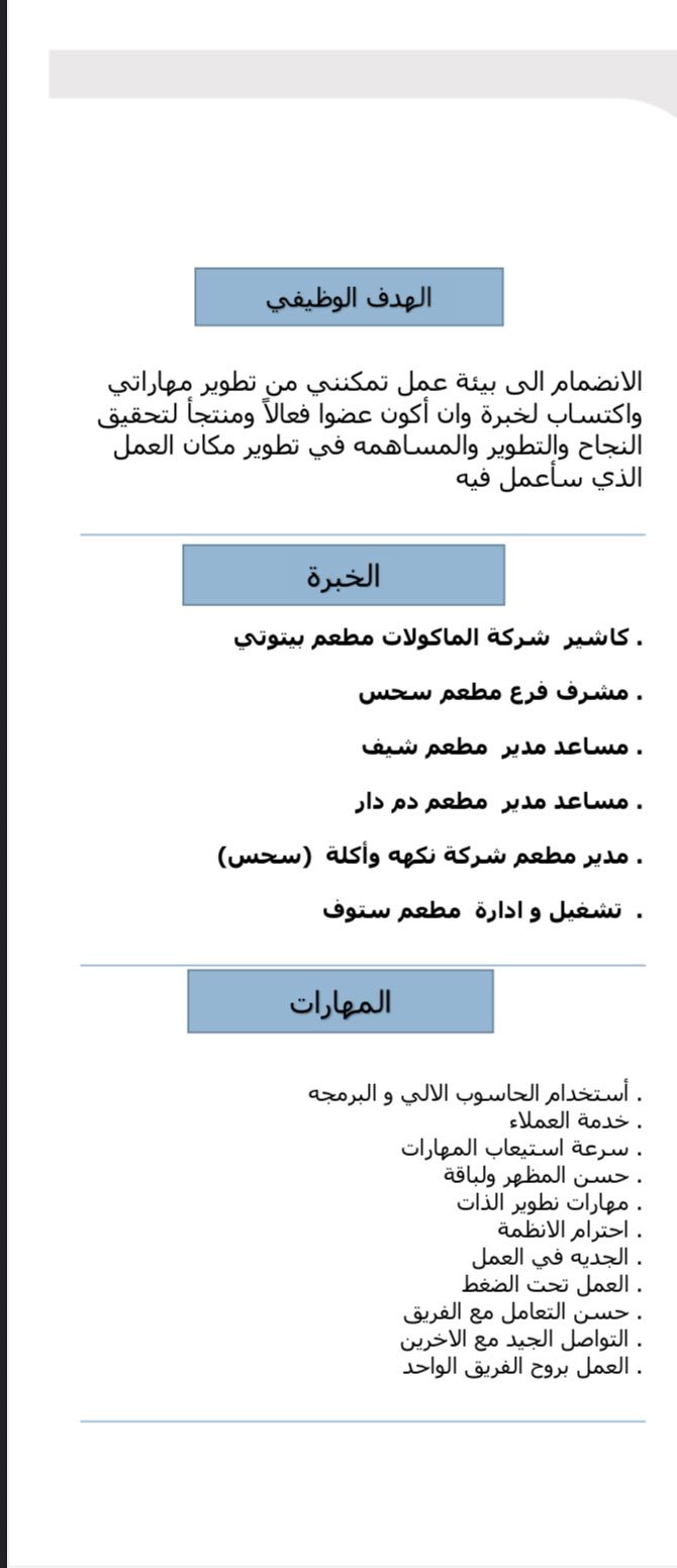 عز الدين إبراهيم الغرباني يمني الجنسية شغال في ادارة وتشغيل المطاعم خبرة في مجال التشغيل خمسة سنوات في مطاعم بيتوتي وسحس وشيف ودم دار وسحس الأمير سلطان وستوف مشاوي