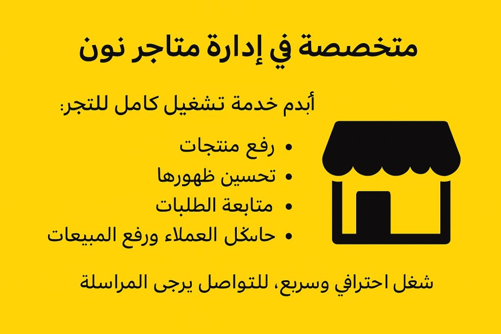 متخصصة في إدارة متاجر نون أقدم خدمة تشغيل كامل للمتجر رفع منتجات، تحسين ظهورها، متابعة الطلبات، حل مشاكل العملاء، ورفع المبيعات. شغل احترافي أكثر من خمس سنوات في ادارة متاجر نون، للتواصل يرجى المراسلة