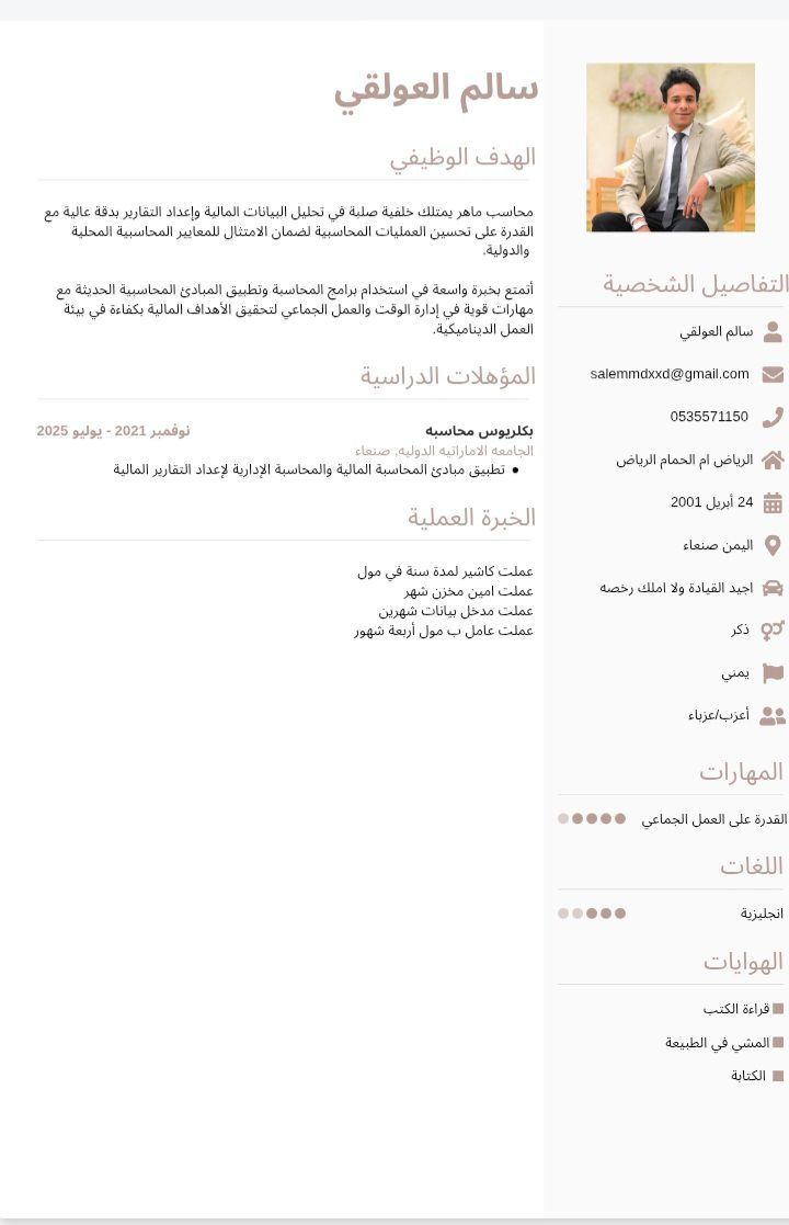 محاسب حديث التخرج عملت كاشير لمدة سنة في مول عملت أمين مخزن شهر عملت مدخل بيانات شهرين عملت عامل ب مول أربعة شهور أجيد التحدث باللغة الانجليزية ب شكل بسيط (word - excel - Power Point) لدي خبرة في أل أستطيع القيادة محتاج رخصة فقط لدي اقامة سارية العمر 23 سنة