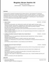 متخصص في إدارة العمليات وخدمة العملاء ولدي خبرة في إدارة المستودعات ومراقبة المخزون مع الالتزام بمعايير الجودة والسلامة. لدي خبرة في تطبيق مبدأي إدارة المخزون (FIFO وLIFO) لضمان دوران المخزون، وتقليل المواد منتهية الصلاحية أو القديمة، والحد من الهدر، وخاصة السلع القابلة للتلف أو منتهية الصلاحية. لدي القدرة على العمل تحت الضغط وتحقيق الأهداف ضمن فريق واحد