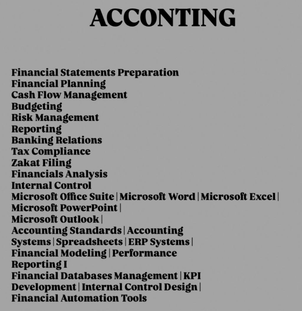 Financial Manager - Head of Finance Department, Internal Auditor (Bachelor's Degree in Accounting) seeking employment Financial statement preparation - Budget preparation - Financial planning - Cash flow management - Tax compliance - Zakat reporting - Financial analysis - Internal control - Risk management - Reporting - Bank relationship management - Internal audit)
