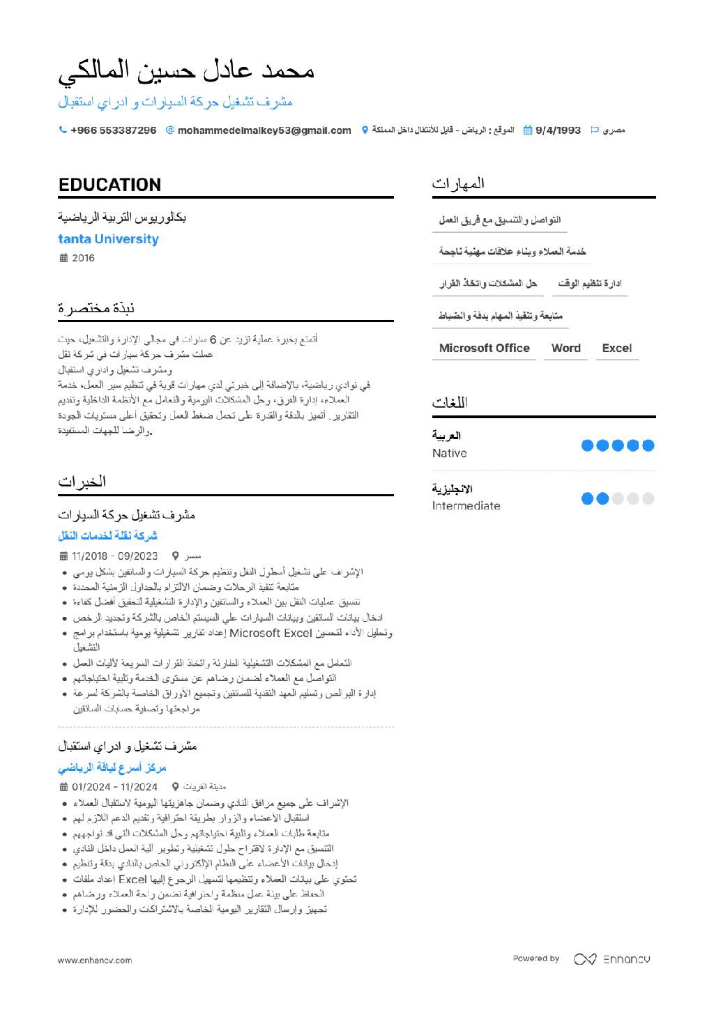 امتلك خبرة عملية تزيد عن 6 سنوات في مجالي الإدارة والتشغيل، حيث عملت مشرف حركة سيارات في شركة نقل ومشرف تشغيل واداري استقبال في نوادي رياضية، بالاضافة الى خبرتي لدي مهارات قوية في تنظيم سير العمل، خدمة العملاء، إدارة الفرق، وحل المشكلات اليومية والتعامل مع الأنظمة الداخلية وتقديم التقارير. حاصل على بكالوريوس تربية رياضية، ولدي رخصة قيادة سعودية ومصرية، وأتقن استخدام برامج Microsoft Office