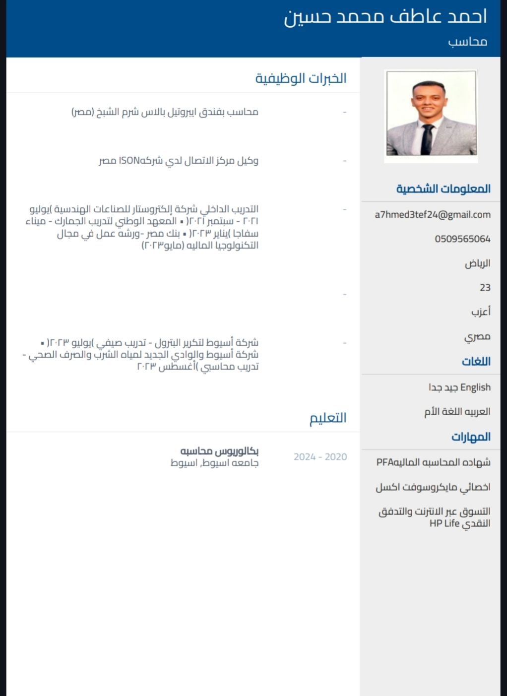 أحمد عاطف محمد حسين العمر 24 مصري التعليم بكالوريوس محاسبه الخبرات الوظيفيه محاسب بفنادق سياحية المهارات - مايكروسوفت أوفيس) وورد اكسل أكسس، أوتلوك، بوربوينت) استخدام برامج المحاسبة إدارة الوقت - العمل الجماعي التفكير النقدي القيادة إدارة المشاريع - العلاقات العامة سريع التعلم الإقامة سارية لمدة عام