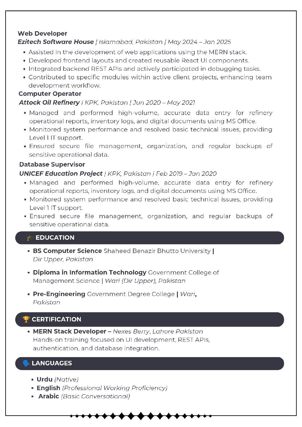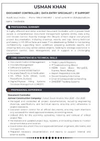 My name is Usman Khan, currently based in Riyadh with a transferable Iqama. I hold a BS in Computer Science and a Diploma in IT, and I am seeking a suitable position in Document Control, Data Entry, Data Management, or IT support. I have strong experience in document handling, data accuracy, DMS/ ERP systems