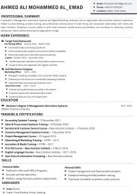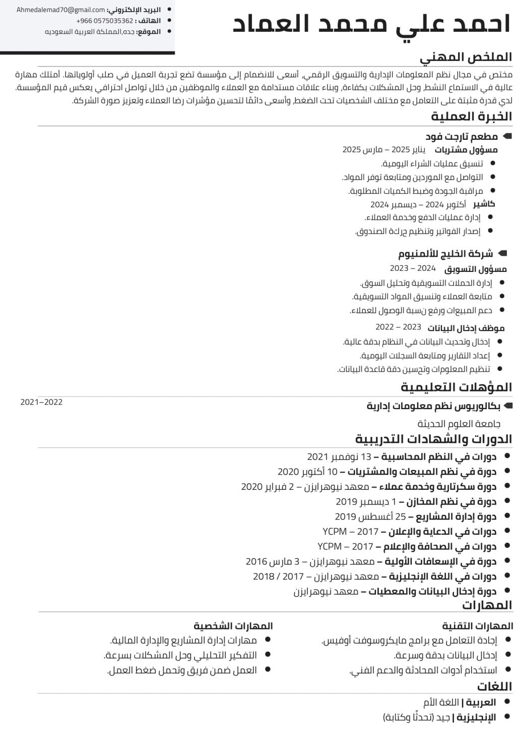 أحمد العماد / 25 سنة/ يمني الجنسية / بكلوريوس نظم معلومات اداريه / لدي خبار في الحاسوب واستخدام برامج الا وفس وفي ادخال البيانات والتسويق الرقمي والميداني أيضا ولدي خبرة في التصوير والم نتاج والتعديل الوني
