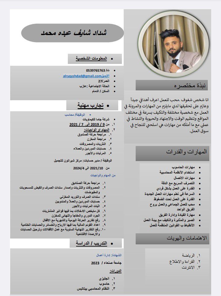 شداد العريقي بكالوريوس ادارة أعمال خبرة واسعة في ادارة الحسابات أكثر من أربع سنوات طموحي الأنظم أم الى فريق عمل متميز