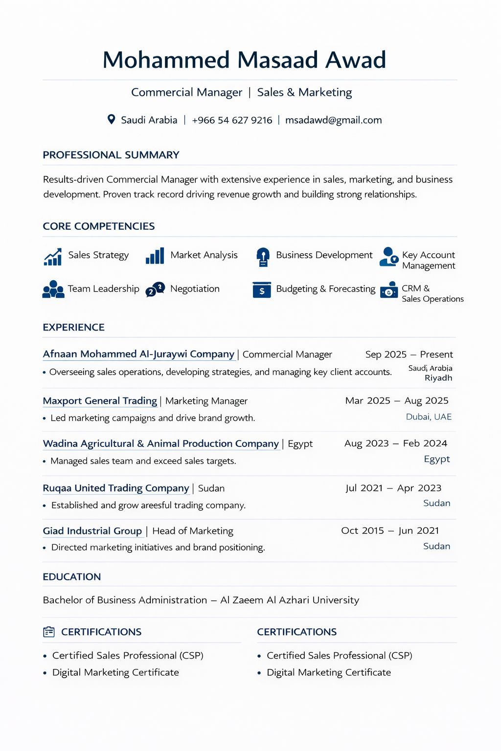 Commercial Manager (Sales & Marketing) with over 12 years of experience in revenue management, market development, and building sales and marketing strategies. Proven expertise in leading teams, managing key accounts, and achieving sustainable business growth across Saudi Arabia and the Gulf region. Available to start immediately