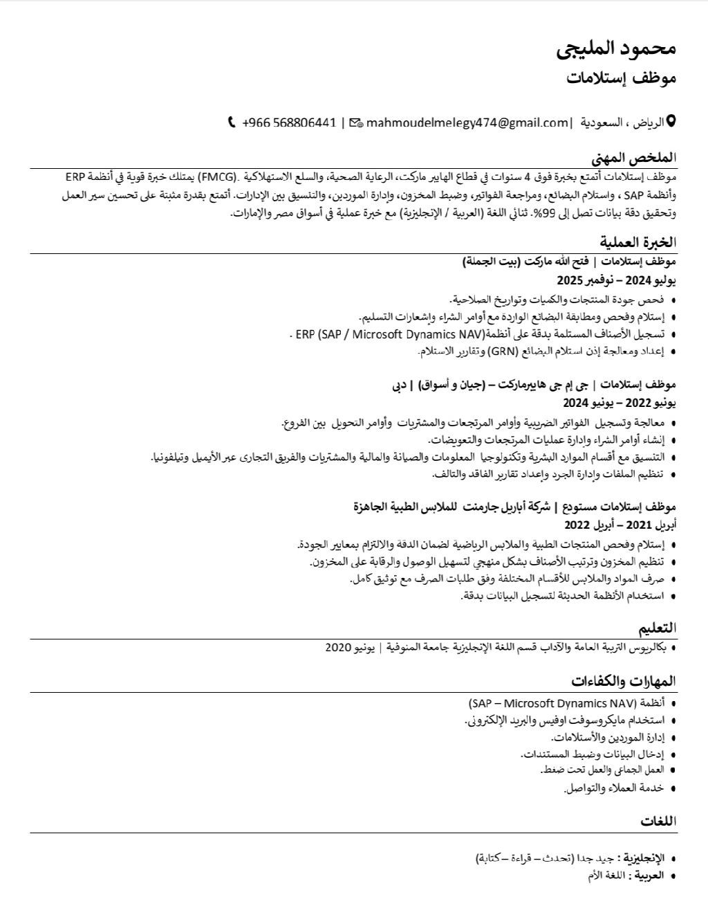 موظف استلامات وأمين عهده خبرة 5 سنوات في قطاع الهايبر ماركت والمواد الغذائية البيع بالتجزئة وشركات الملابس الجاهزه في مصر والامارات ومقيم في الرياض 28 سنة مصري الجنسية