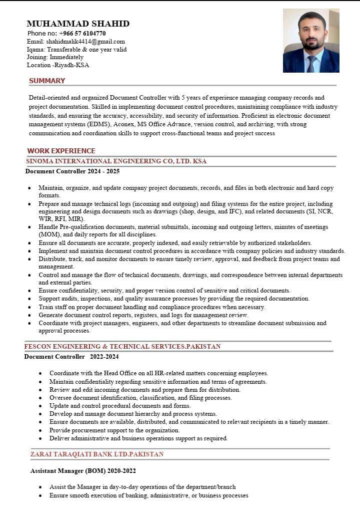Qualified Document Controller with 5 years experience of documentation in construction & Banking Administrator. Responsibilities - Maintain, organize, and update company/ project documents, records, and files in both electronic and hard copy formats. Preparing Technical logs (outgoing and incoming) Filings for the whole project whether it is Engineering and Construction
