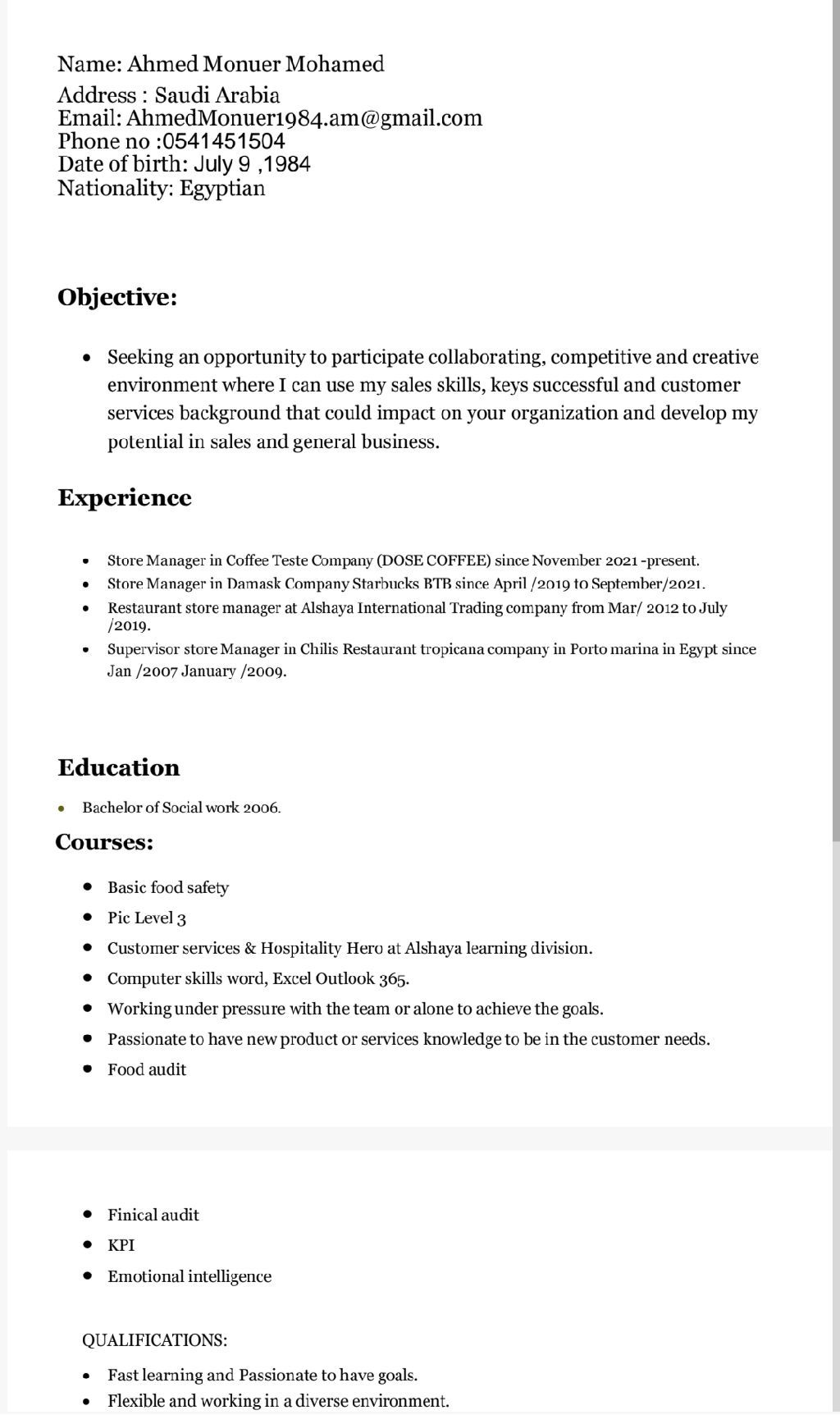 متاح للعمل فورا مدير كوفي شوب مشرف كافية بخبرة قوية في إدارة العمليات الاشراف على الفريق، ضبط الجودة، زيادة المبيعات وخدمة العملاء باحترافية عالية. امتلك خبرة في إدارة المخزون، الجداول، التدريب، وتحقيق الأهداف التشغيلية. جاهز للعمل بدوام كامل أو جزئي. للتواصل