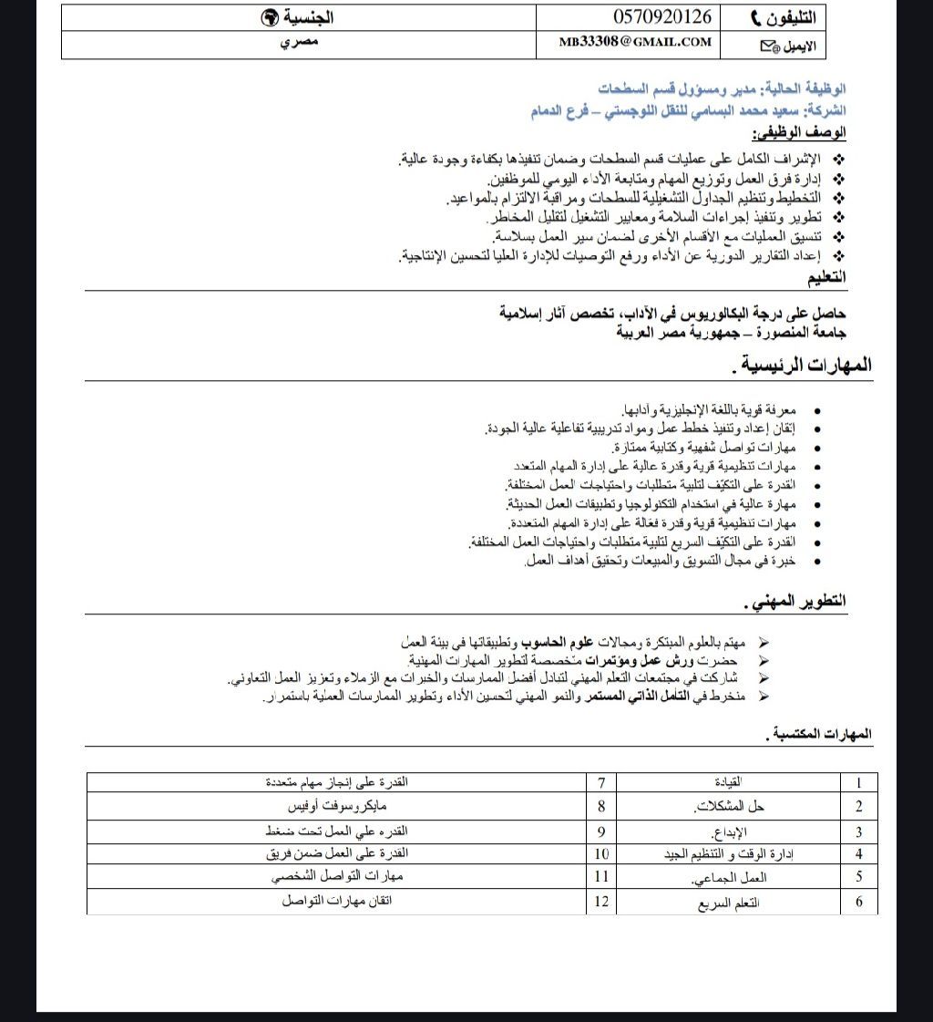 I am seeking employment with an agency or institution. My current role is Head of the Movement Department at one of the major logistics transport companies in the Kingdom of Saudi Arabia. Please contact via WhatsApp or call the number attached to the job application data