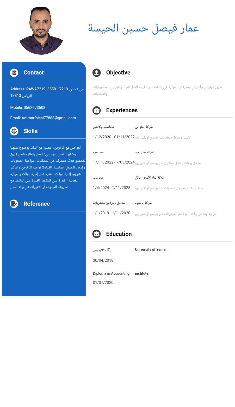 عامل ومدخل بيانات ومساعد محاسب عملت كمدخل بيانات عبر برنامج الأونكس برو + الشامل + أنفوا سوفت وخبرة في محلات الخضار والبقالات أكثر من 5 سنوات إقامة سارية متواجد الرياض وفي أي مكان للتواصل