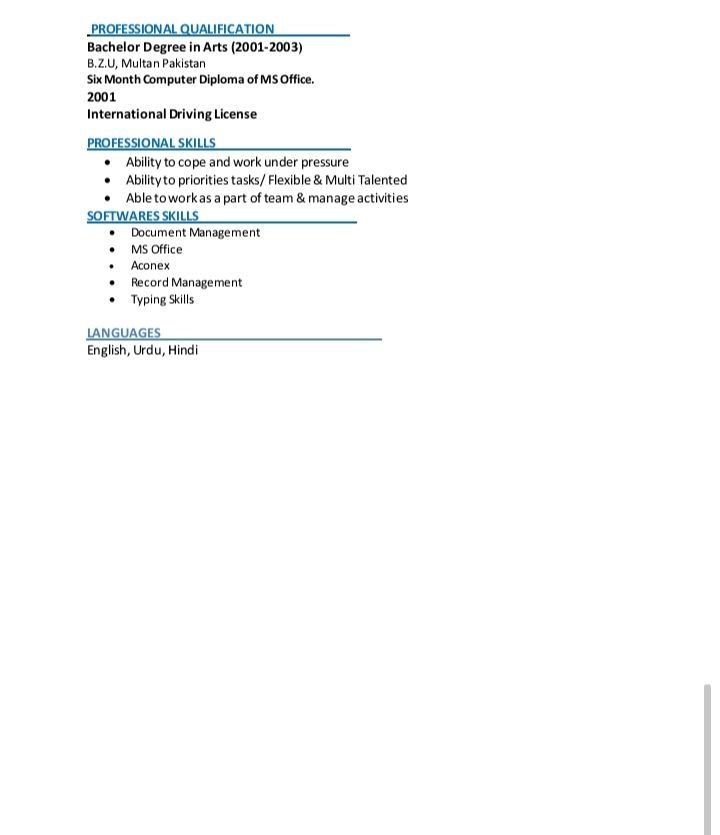 I am looking for a Document Controller, Administrator in office, Assistant Manager, Data entry operator Assistant HR position where I can apply my 5 years of experience in office management & Administration I can all about office documents like invoices, DAILY REPORT, DAILY ACTIVITIES, TECHNICAL SUBMITTALS, I CAN Operate MS Office ADVANCE AND EDMS, ERP