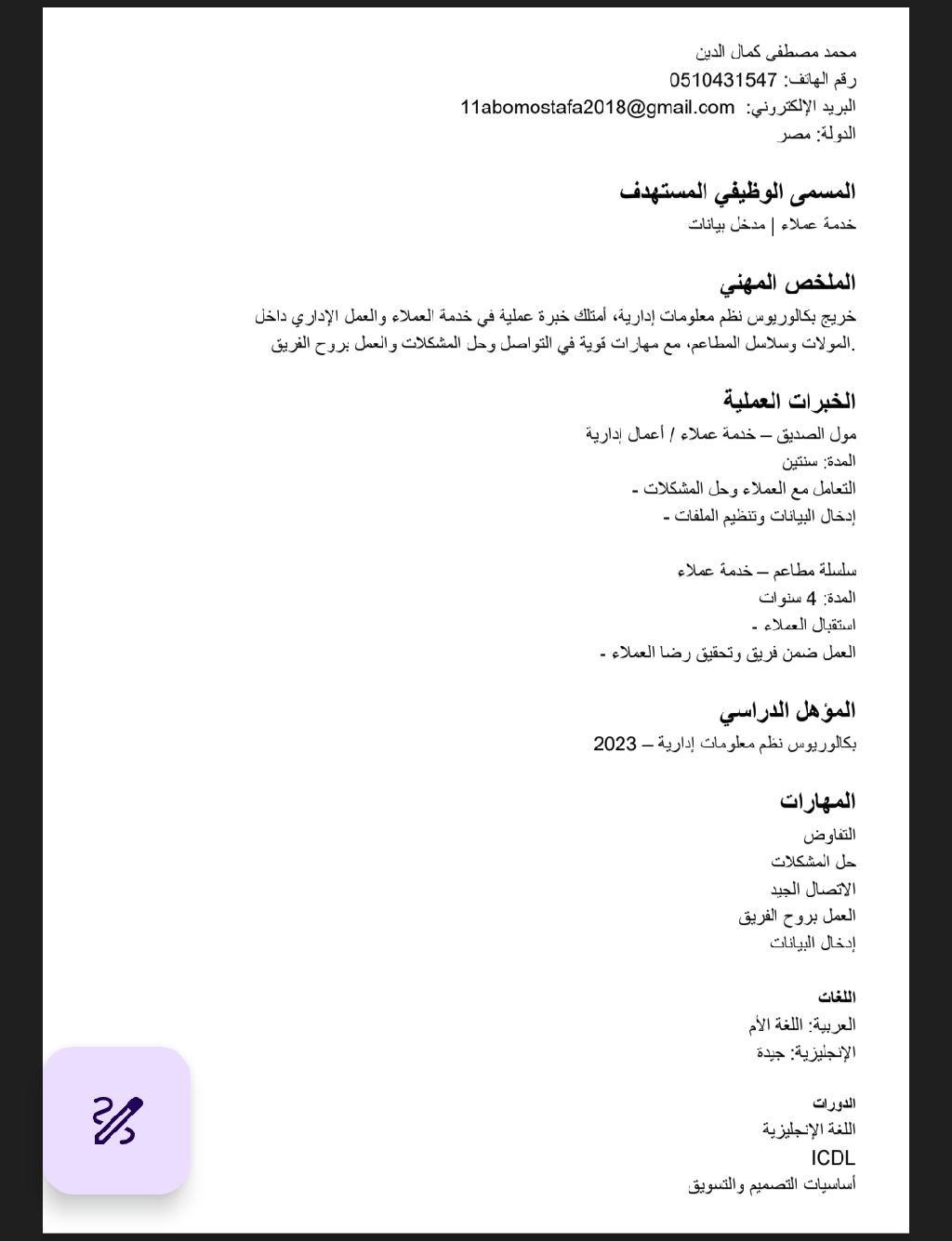 أنا خريج نظم معلومات ادارية، لدي خبرة 6 سنوات في خدمة العملاء والأعمال الادارية داخل المولات وسلاسل المطاعم. أتميز بمهارات قوية في التواصل، حل المشكلات، ادخال البيانات، وتنظيم الملفات. أجيد التعامل مع أنظمة الحاسب وبرامج Microsoft Office، واعمل بروح الفريق وتحقيق رضا العملاء. ابحث عن فرصة عمل مستقرة أضيف فيها قيمة حقيقية للمؤسسة وأطور من مهاراتي المهنية. متاح للعمل فورا - ملتزم - سريع التعلم