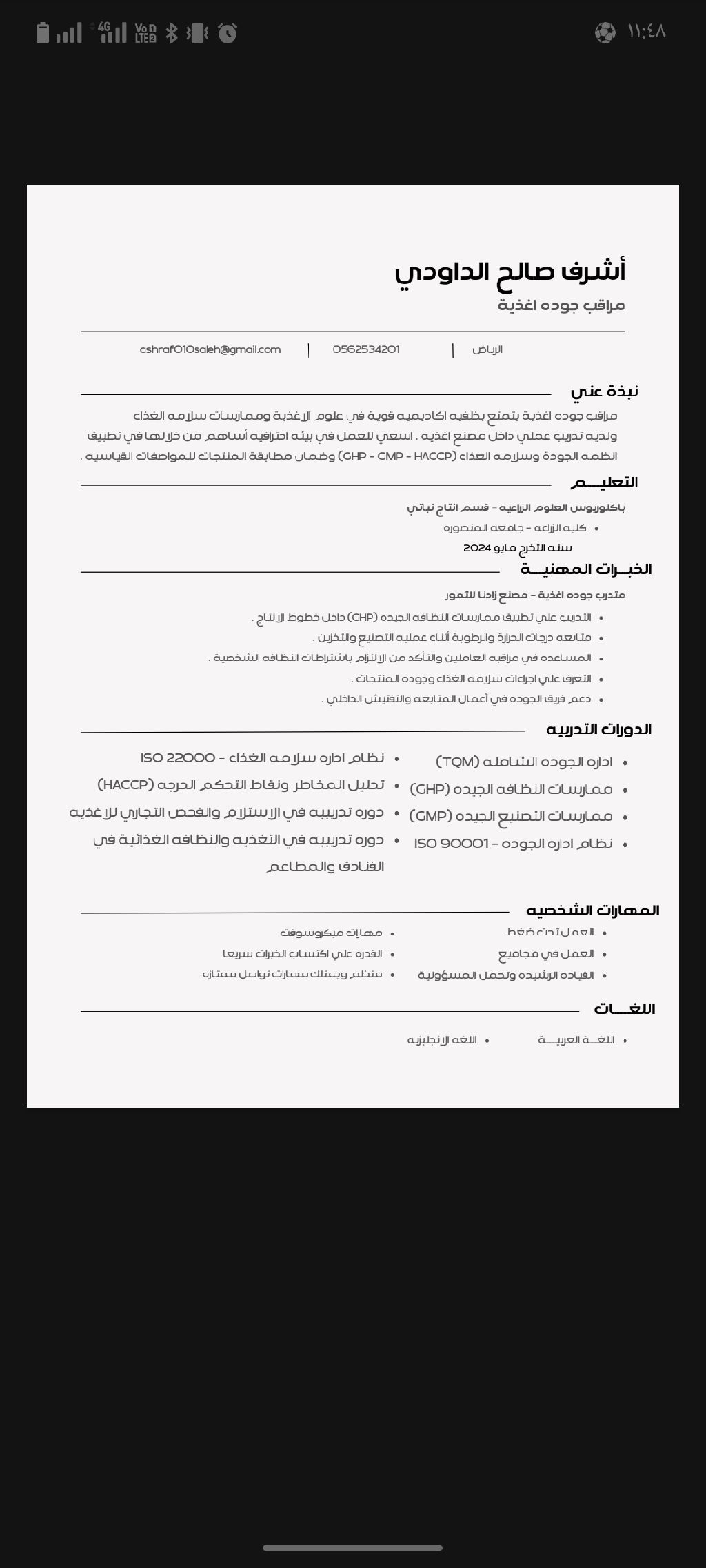 مراقب جودة اغذيه أتمتع بخلفيه أكاديمية ولدي خبرة داخل المجال وحاصل علي عدة شهادات ودورات تدريبية (GHP - GMP - HACCP)