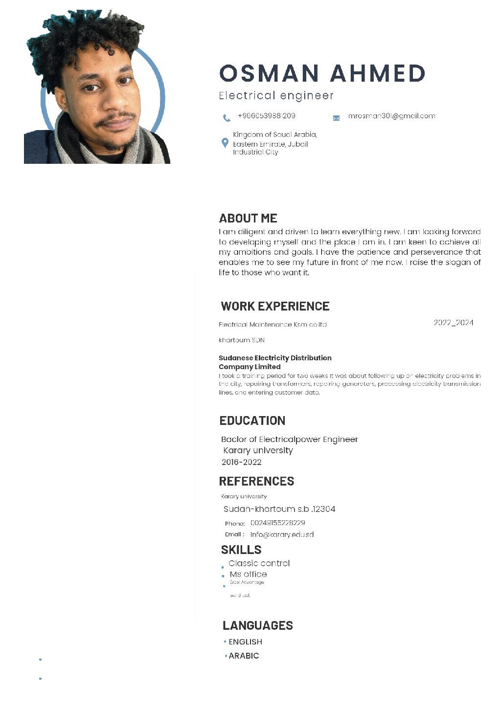 مهندس كهرباء سوداني خريج 2022 العمر 29 خبرة عامان متواجد في الجبيل