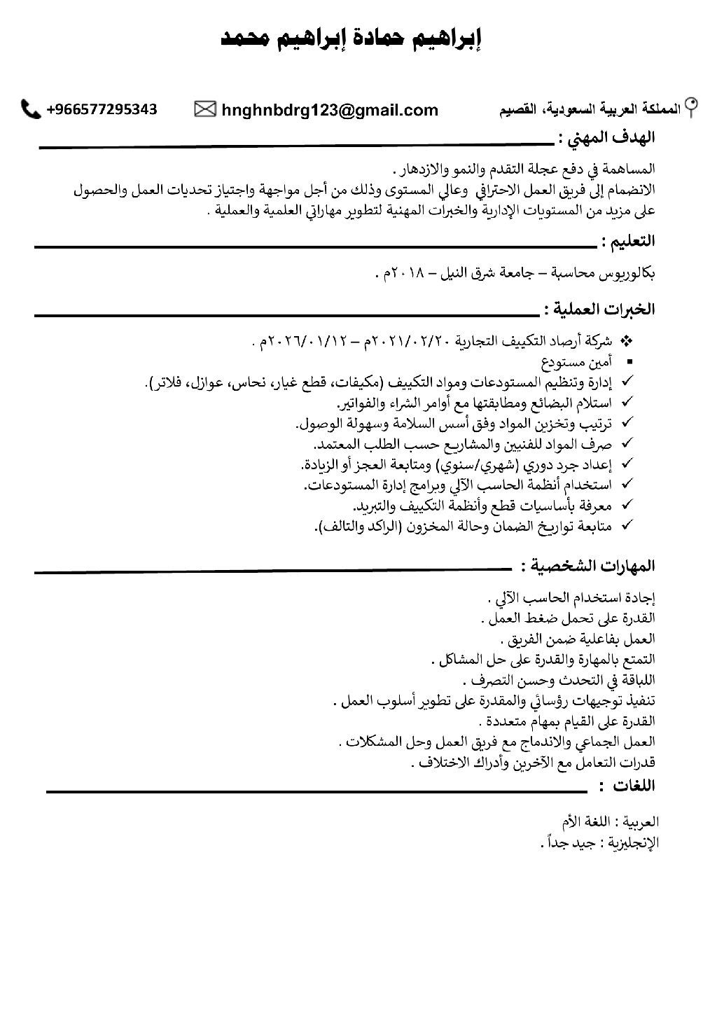 إدارة وتنظيم المستودعات ومواد التكييف (مكيفات، قطع غيار، نحاس، عوازل، فلاتر) استخدام أنظمة الحاسب الآلي وبرامج ادارة المستودعات، معرفة بأساسيات قطع وأنظمة التكييف والتبريد، استلام البضائع ومطابقتها مع أوامر الشراء والفواتير، حاصل على بكالوريوس محاسبة عام، خبرة 6 سنة داخل المملكة